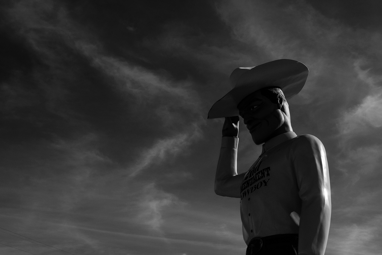 Despite not being armed or having an ammo bandolier, this muffler man (large sculpture placed as advertising icon or roadside attraction) is known as the 2nd Amendment Cowboy and exists to remind people of the right to bear firearms. More muffler men here and more about firearms in Tom’s portrait.